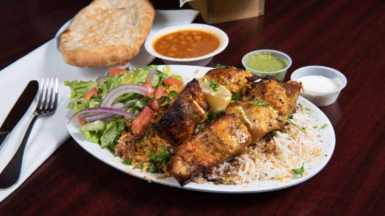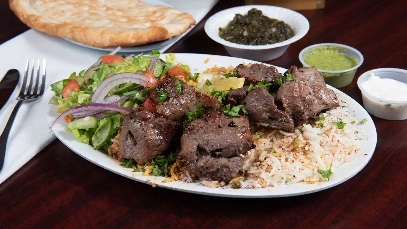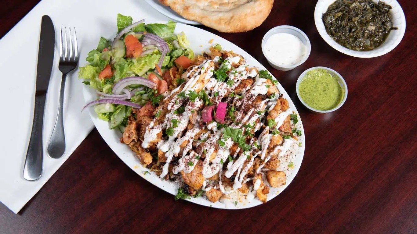 The menu is extensive, featuring grilled meat platters—chicken, beef, lamb, shrimp, and salmon—served with rice, salad, bread, and flavorful sauces. Vegetarian and vegan options are available too, including falafel, hummus, baba ghanouj, samosas, and grape leaves. Appetizers, soups, salads, desserts, bubble teas, and smoothies round out the offerings, catering to a wide range of dietary preferences .